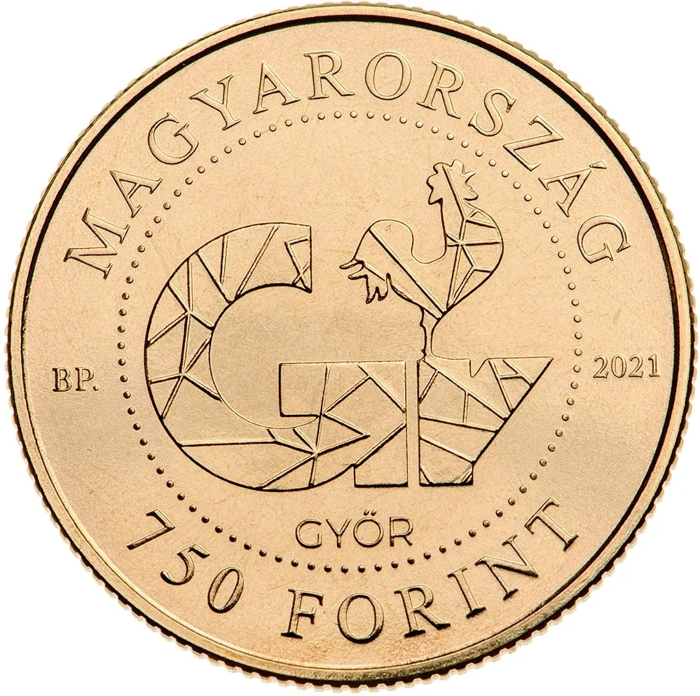 This coin features Győr's historic rooster logo, symbolizing freedom and victory. It recalls the 1598 legend where a rooster's crow helped Christian troops retake the city from the Turks. Date and value.