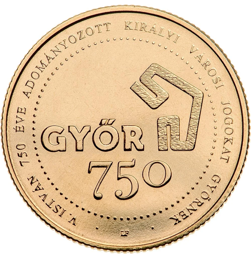 Anniversary logo for Győr's 750th year. Inscription: "V. ISTVÁN HAS GRANTED ROYAL CITY RIGHTS FOR 750 YEARS".