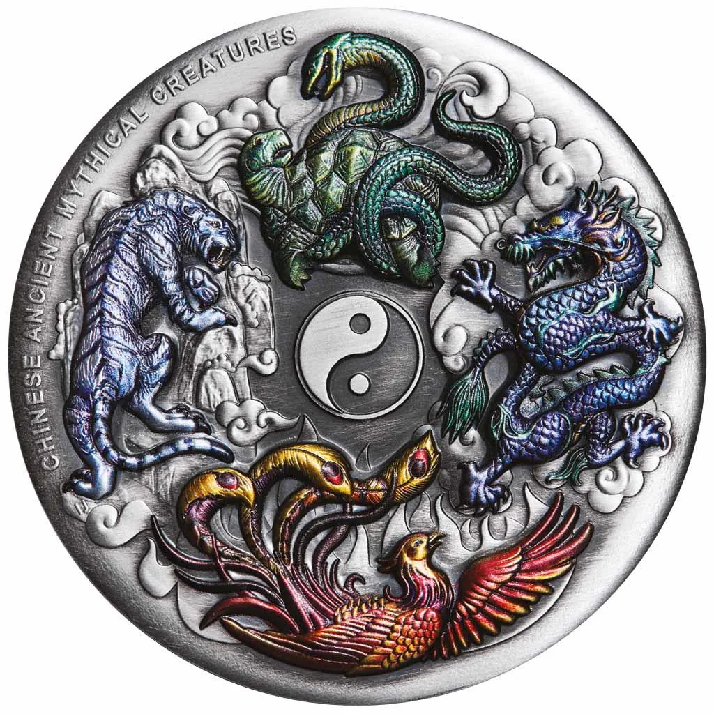 Four mythical Chinese creatures in vibrant color surround a central Yin Yang.