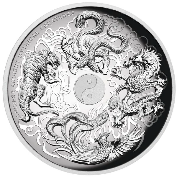 Four mythical Chinese beasts encircling a Yin Yang symbol.