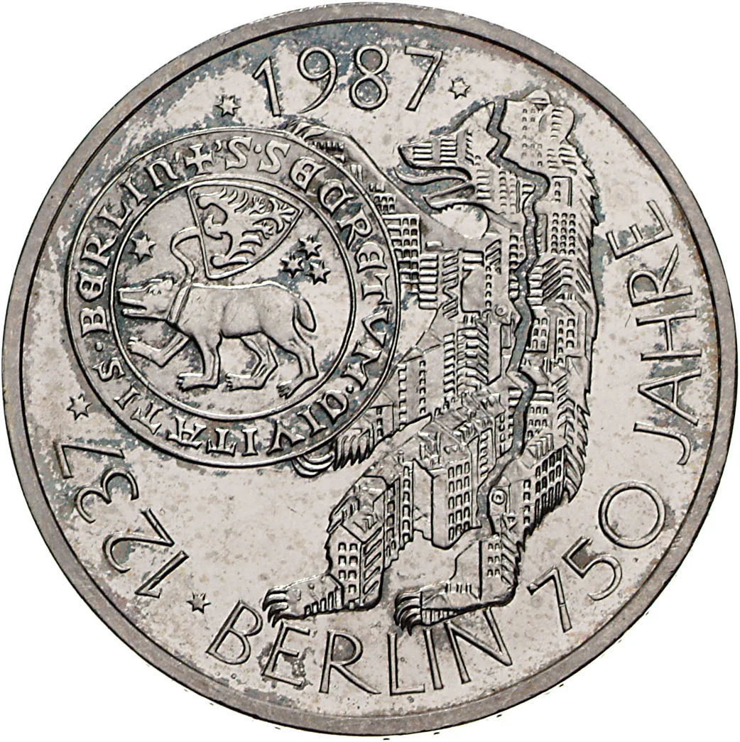 Berlin bear holding the city's medieval seal, with a building façade, Wall pattern, and foundation date.