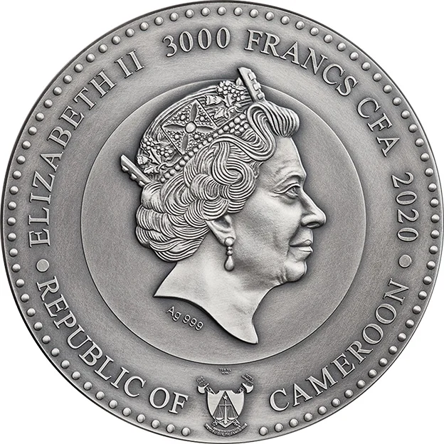 Description: Queen Elizabeth II facing right, wearing the Diamond Diadem and Coronation Earrings. Cameroon's coat of arms below.