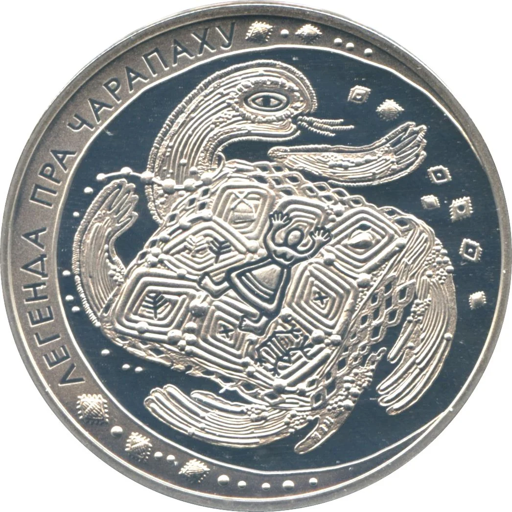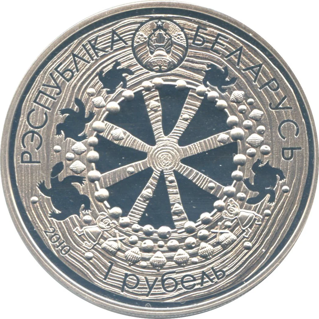Description: Featuring the State Coat of Arms at the top, the center depicts stylized tortoises and women from Belarusian legends, with ornamental patterns on a spinning wheel that transforms into tree rings, symbolizing perpetual motion. The year of issue is at the bottom, with circumferential inscriptions: "РЭСПУБЛІКА БЕЛАРУСЬ" (THE REPUBLIC OF BELARUS) above and "1 РУБЕЛЬ" (1 RUBLE) below.