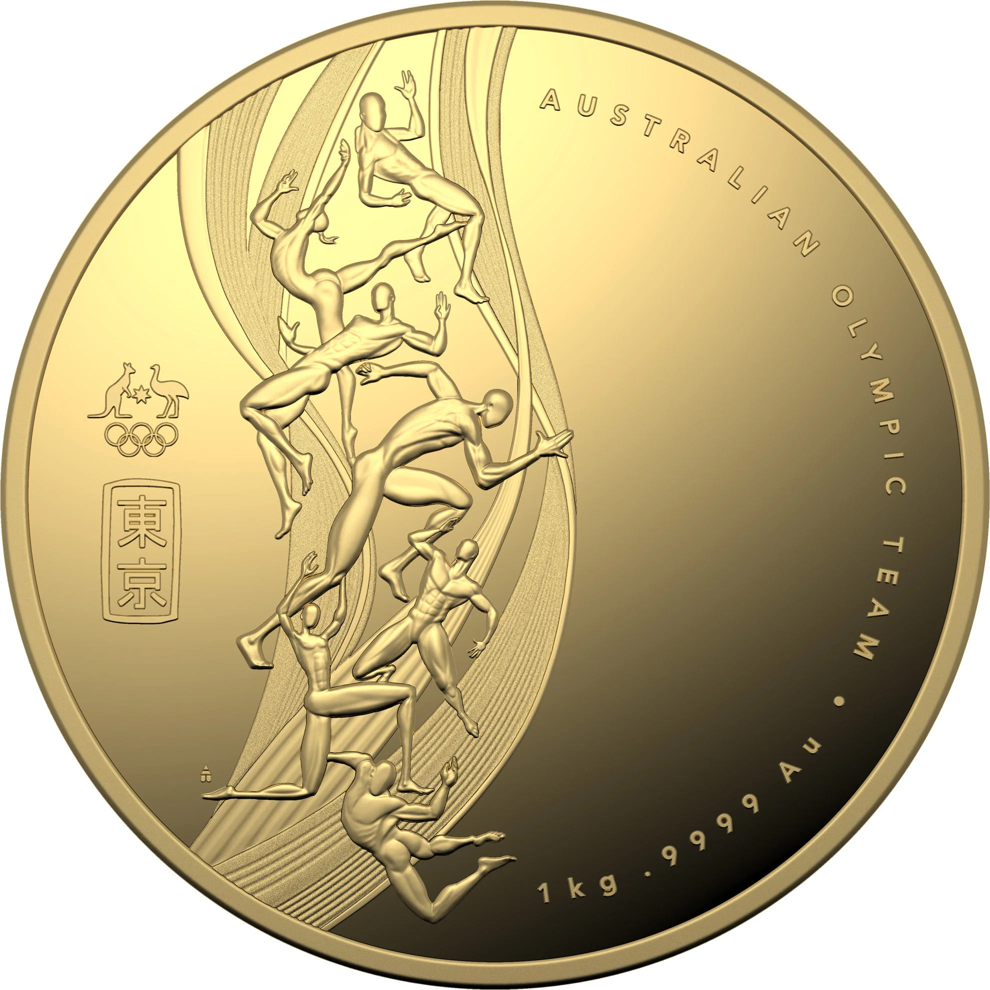 Seven Olympic athletes in motion against a swirling backdrop. Australian team logo and Japanese text at left.