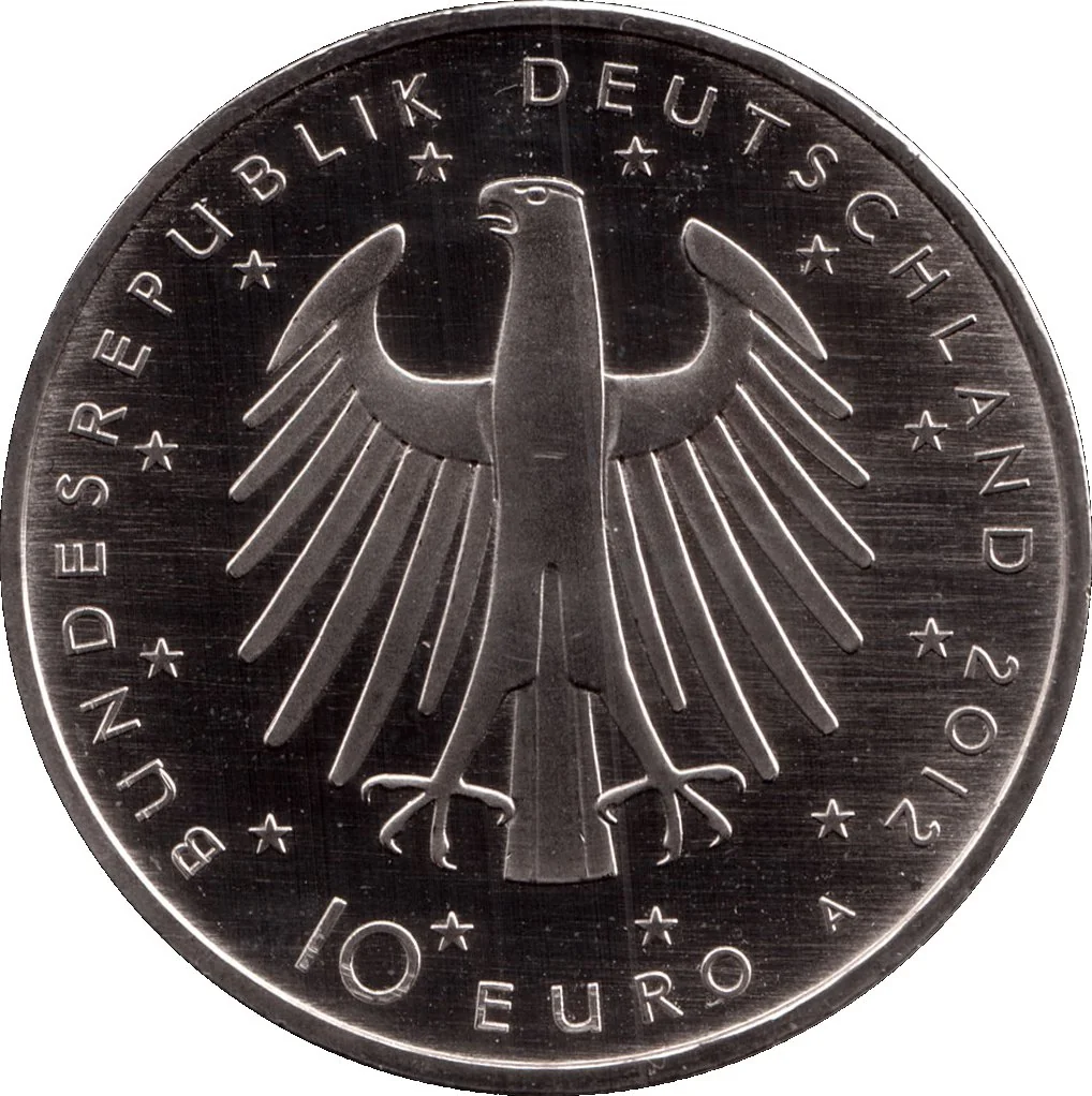Description: The stylized German eagle, encircled by twelve EU stars, is accompanied by the text "BUNDESREPUBLIK DEUTSCHLAND", the year, the Berlin mint mark "A", and the face value "10 EURO".