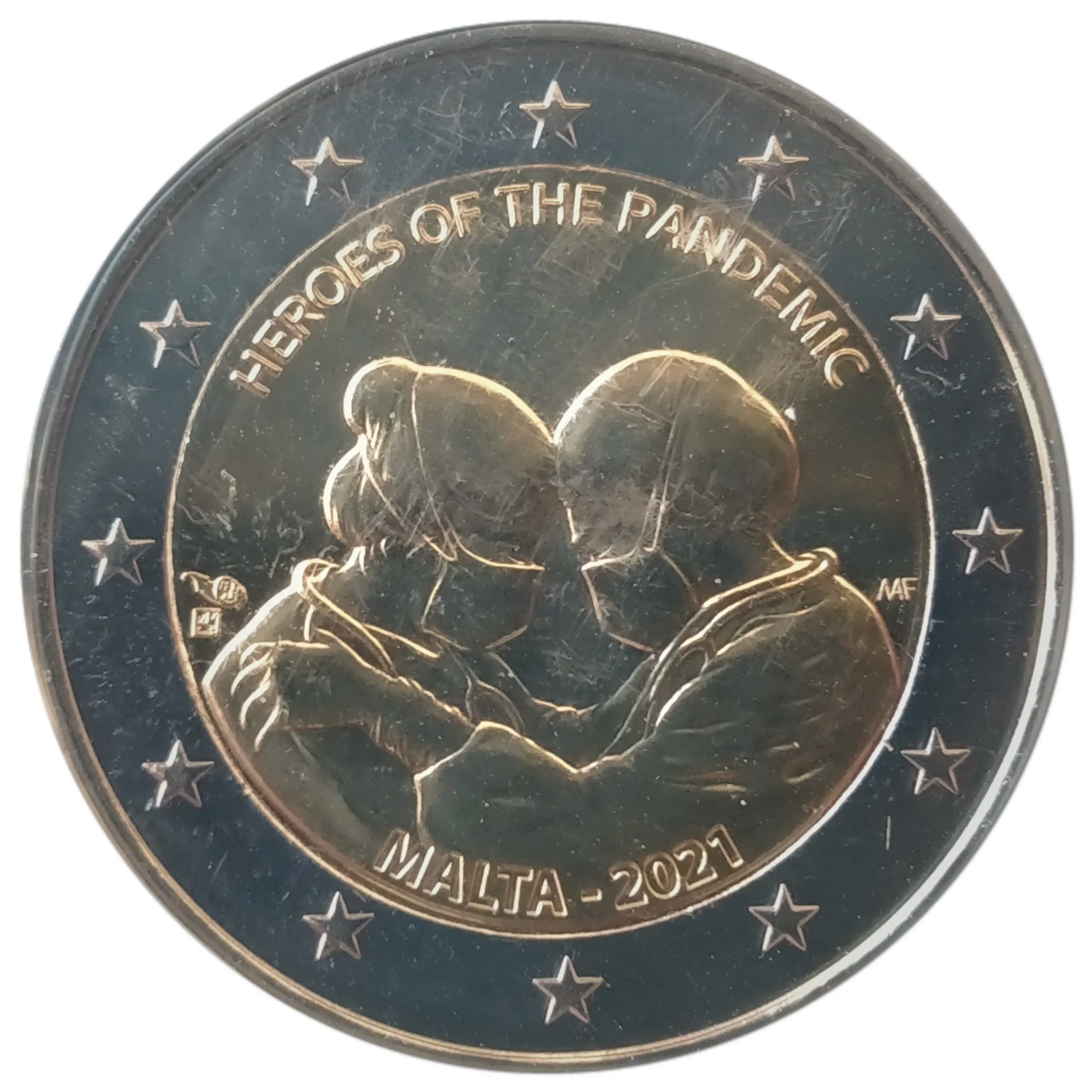 Designed by Maria Anna Frisone, this coin honors medical professionals bravely facing the pandemic. The inscriptions read "HEROES OF THE PANDEMIC" above and "MALTA – 2021" below, encircled by the twelve stars of the European flag.