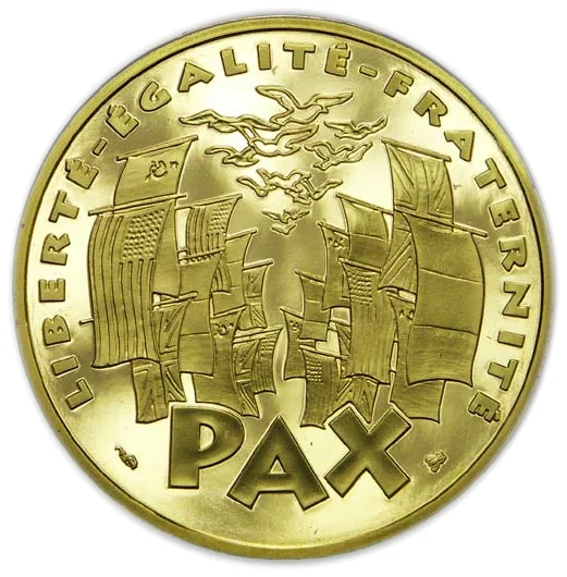 PAX: global flags carried by doves, encircled by "LIBERTY - EQUALITY - FRATERNITY."