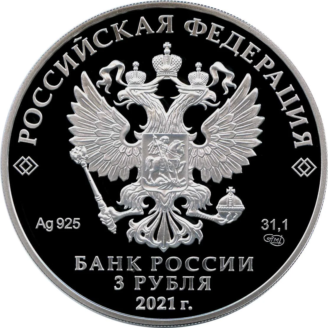 The obverse features the Russian Federation coat of arms with "РОССИЙСКАЯ ФЕДЕРАЦИЯ" above, framed by doubled rhombuses. Below are the metal specification and mint mark. At the bottom is the inscription "БАНК РОССИИ", "3 РУБЛЯ", and "2021 г."