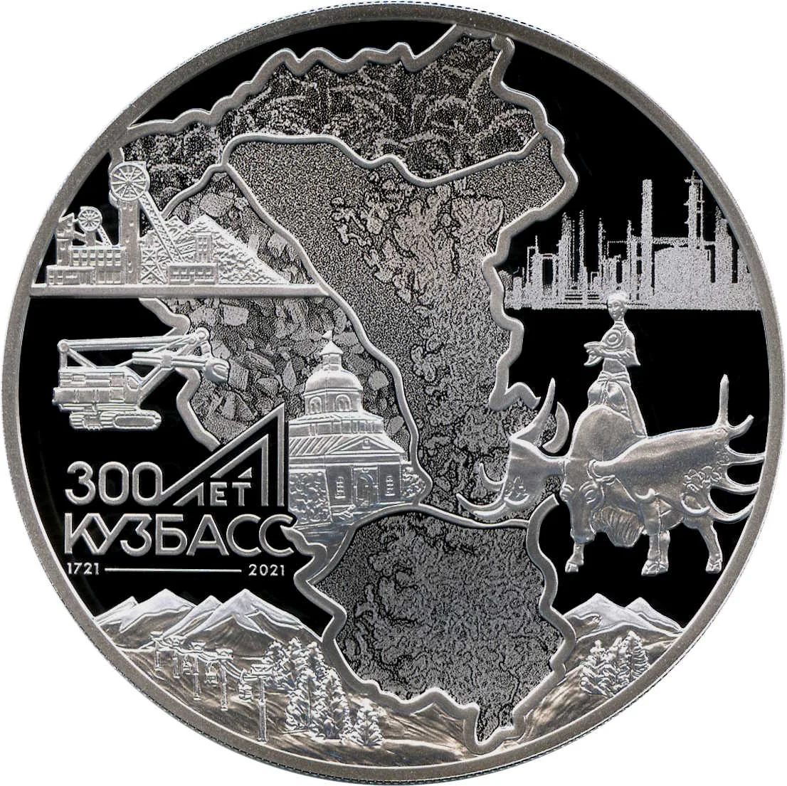 The disc's mirror field features relief images of the Kemerovo Region – Kuzbass contour, symbols for its 300th anniversary, the 'Zolotaya Shoriya' monument, Sheregesh ski resort, the Barnaul gates of the Kuznetsk fortress, and scenes of the region's industrial power.
