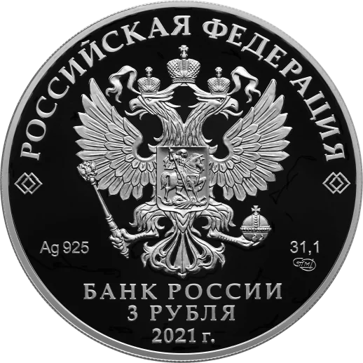 The obverse features the Russian Federation coat of arms with the inscription "РОССИЙСКАЯ ФЕДЕРАЦИЯ" above, framed by doubled rhombuses. Below are the metal specification and mint mark, with "БАНК РОССИИ", "3 РУБЛЯ", and "2021 г." at the bottom.