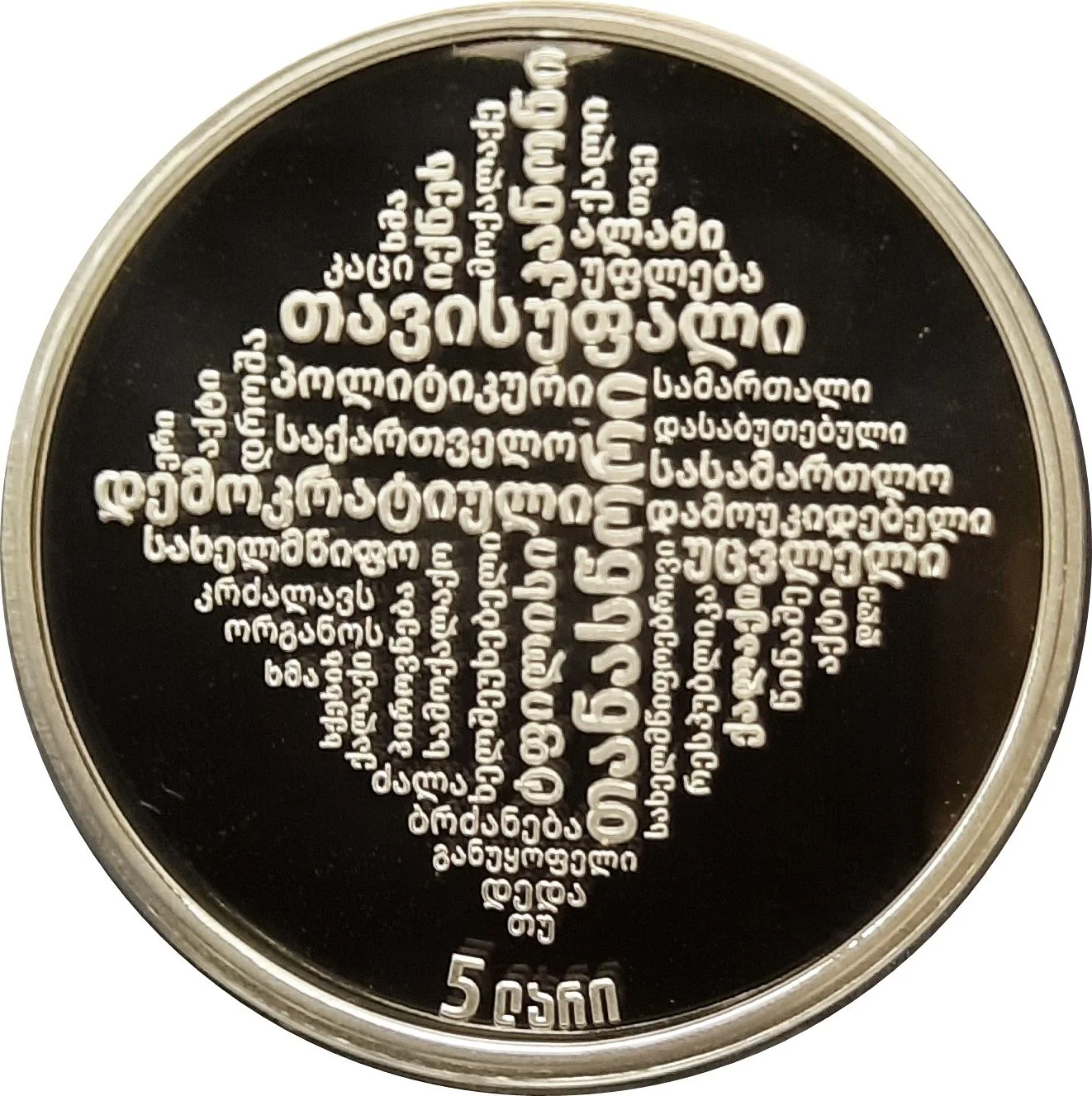 Description: The obverse features intertwined Georgian letters “ს”, “დ”, and “რ”—the initials of საქართველოს დემოკრატიული რესპუბლიკა (Democratic Republic of Georgia, 1921)—above an ornament from its first Constitution. Circling it are the inscriptions: "GEORGIAN CONSTITUTION", “საქართველო”, "GEORGIA", “საქართველოს კონსტიტუცია”, and “1921-2021”.