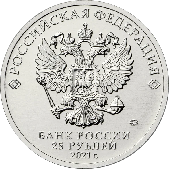 Centered is the relief of the Russian Federation's national coat of arms, above which a semicircular rim inscription reads "РОССИЙСКАЯ ФЕДЕРАЦИЯ," flanked by doubled rhombuses. Below, in three lines, are "БАНК РОССИИ," "25 РУБЛЕЙ," and "2021 г." The mint mark is on the right.