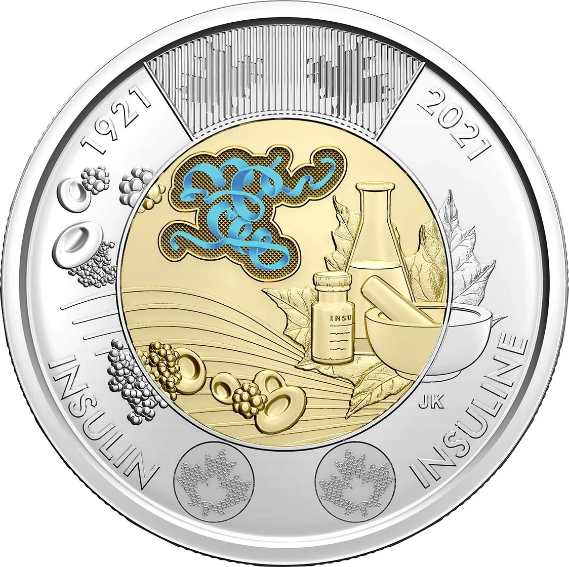 A maple leaf overlaid with early insulin-production instruments—a vial, mortar and pestle, and Erlenmeyer flask—along with red blood cells, glucose, and colored insulin molecules. The outer ring reads INSULIN / INSULINE and the years 1921 / 2021.