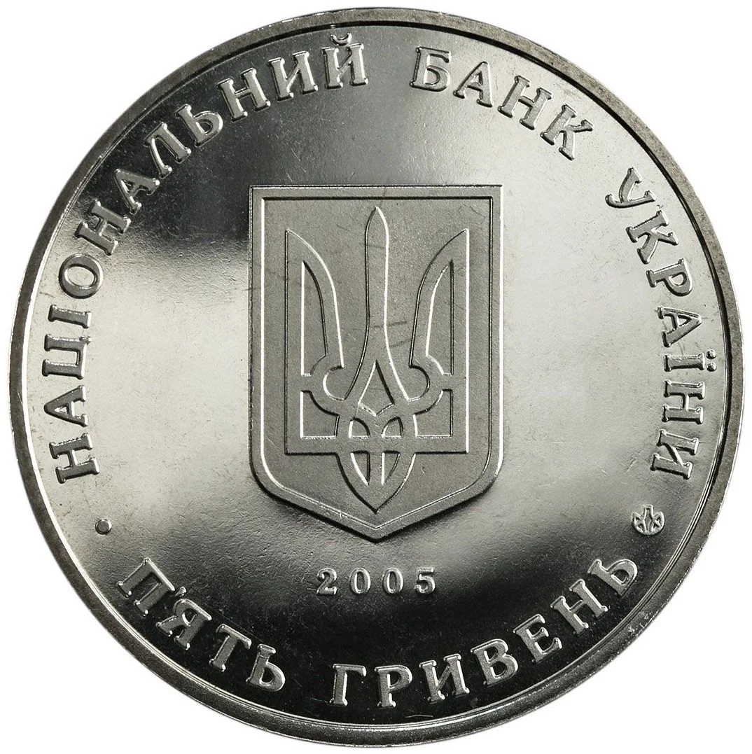 The center features the small National Emblem of Ukraine above the year 2005, surrounded by the inscriptions: НАЦІОНАЛЬНИЙ БАНК УКРАЇНИ and ПЯТЬ ГРИВЕНЬ, along with the Mint's logotype.