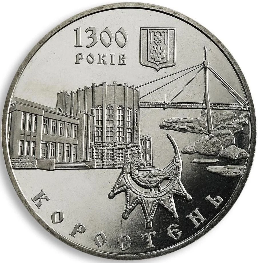 The town panorama features a foreground silver earring (pre-946) found locally. The top right corner displays the Korosten coat of arms, with inscriptions: "1300 РОКІВ" above left and "КОРОСТЕНЬ Korosten" below in a semicircle.