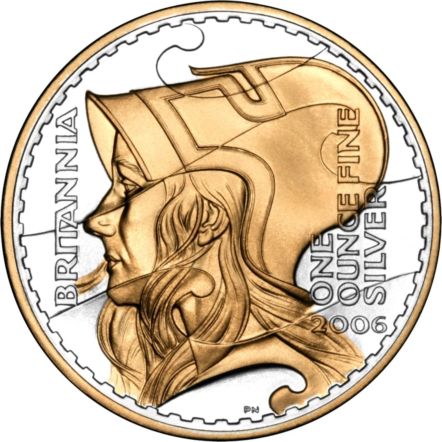 Britannia's helmeted head left, overlaid with a stylised wave, with legend before and behind.