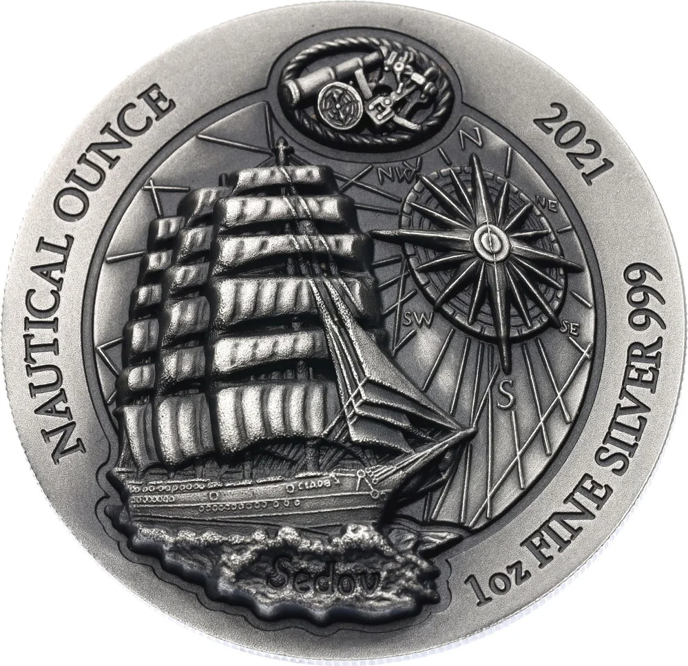 Sedov left, compass rose upper right, nautical instruments upper center.