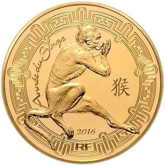 The inner coin depicts a monkey, the ninth fire sign of the Chinese zodiac, surrounded by the inscriptions "Year of the Monkey," "2016," and Chinese characters, all within a frieze near the edge.