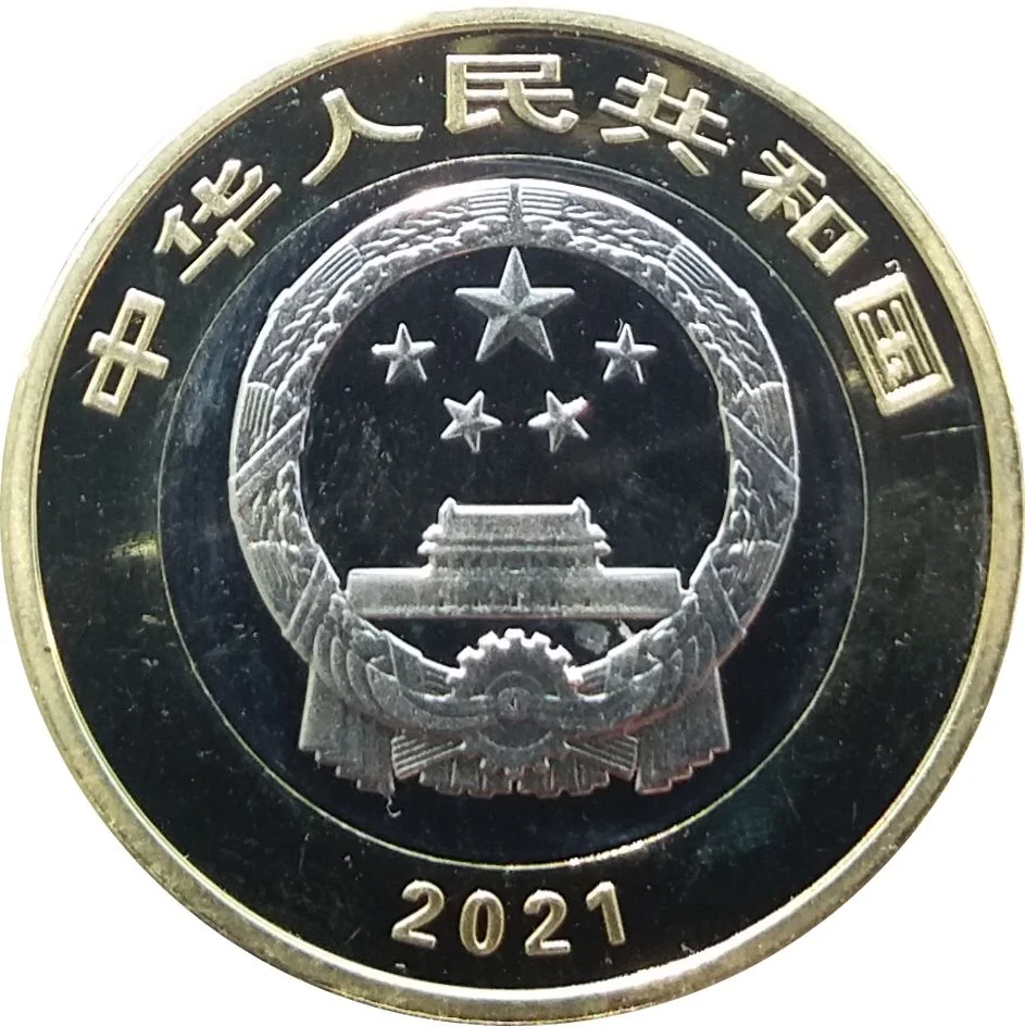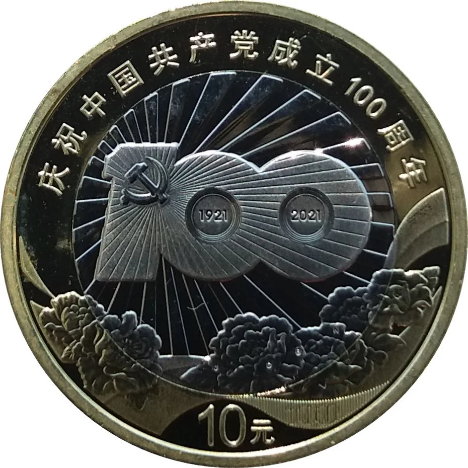 Official 100th Anniversary design for the Communist Party of China. The number "100" incorporates the Party emblem (hammer and sickle) in the "1" and anniversary dates in the "0"s, with light rays and flowers. Face value below.