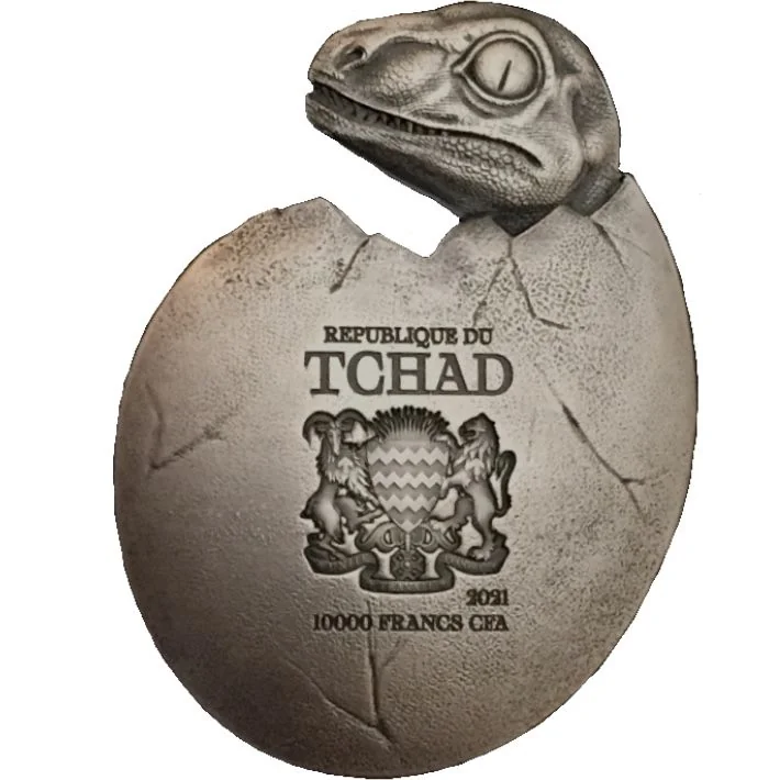 The hatching velociraptor's head emerges above its cracked shell, with the coat of arms, year, and face value centered below.