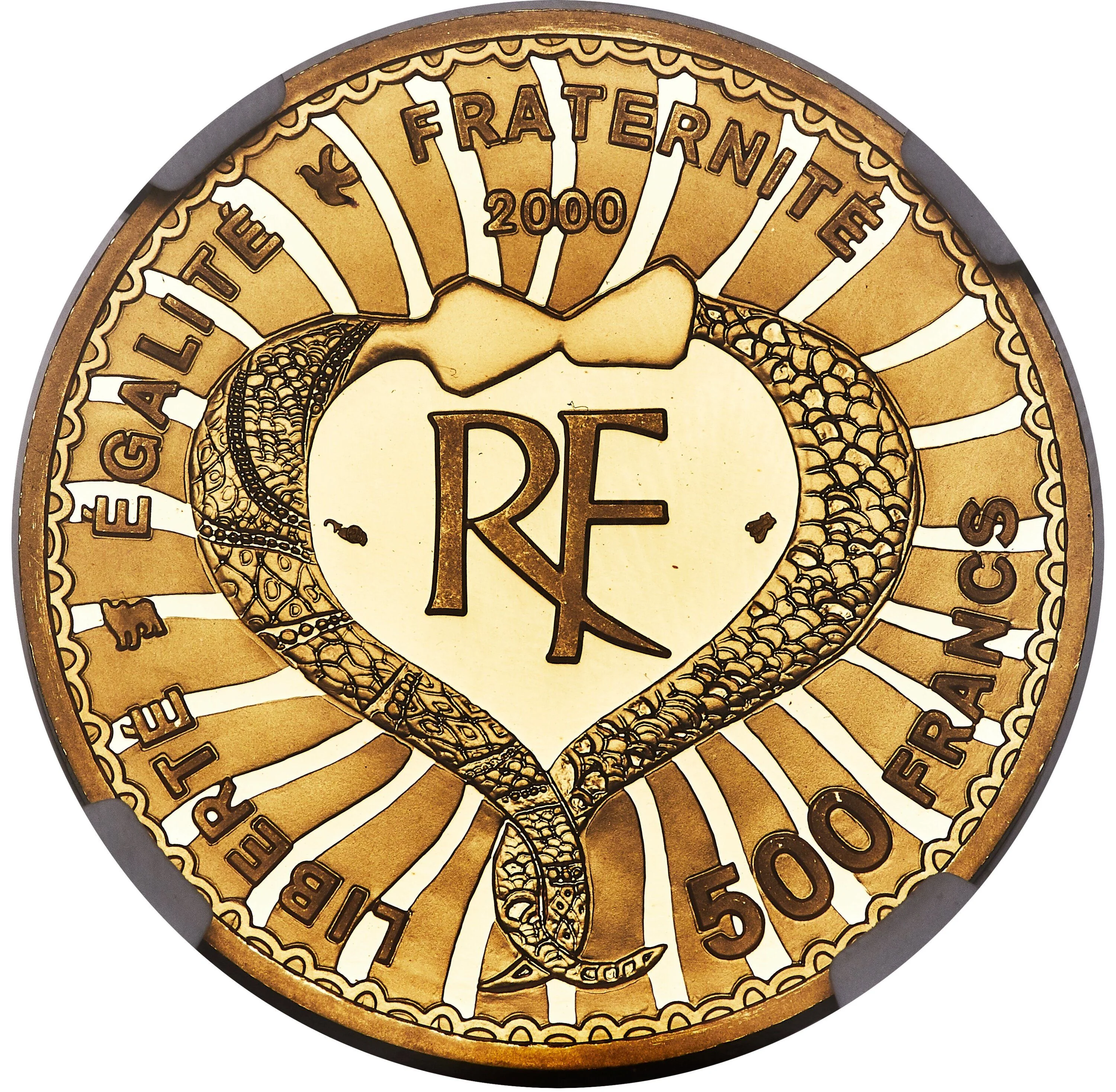 RF monogram and entwined snakes separate value and year.