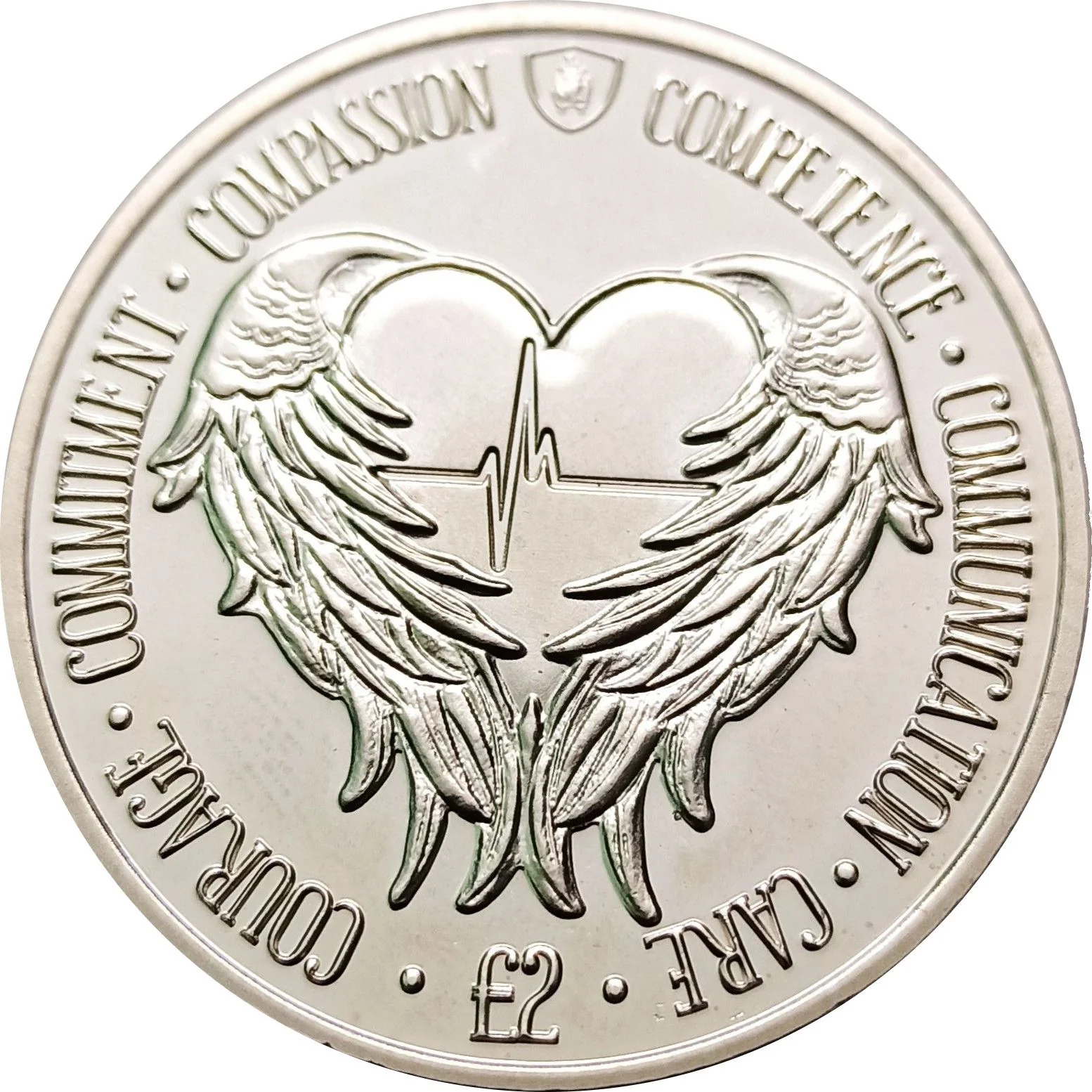 A heart with a heartbeat line, encircled by angel wings symbolizing caregiver protection. It is surrounded by the 6Cs of Compassion in Practice and the Coat of Arms of South Georgia & the South Sandwich Islands.