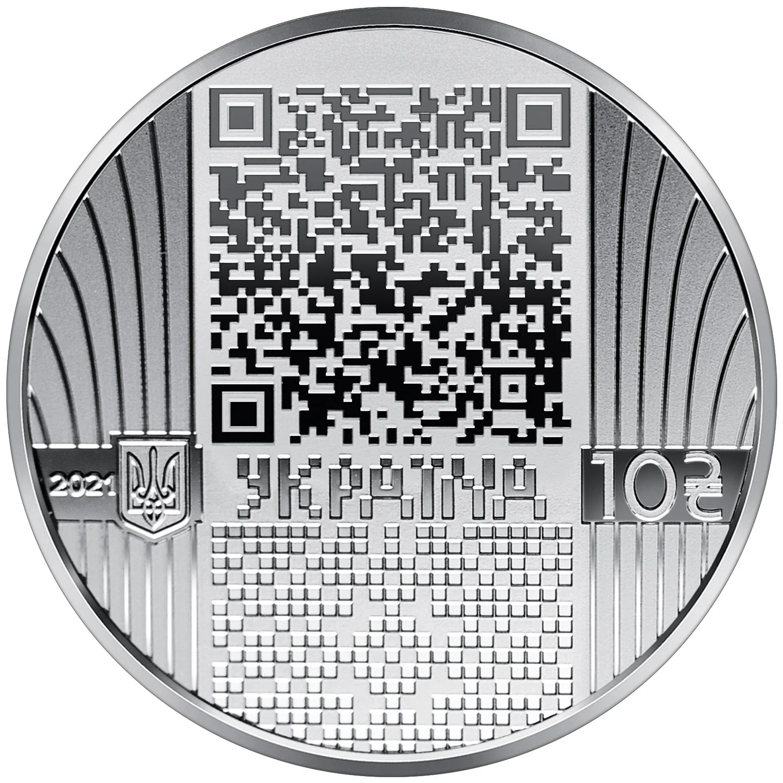 The left side features the year 2021 and Ukraine's small coat of arms. A central composition links past and present: a QR-code for digital transformation above stylized embroidery, a treasure of national symbols. The right side has the face value "10" and the hryvnia sign.