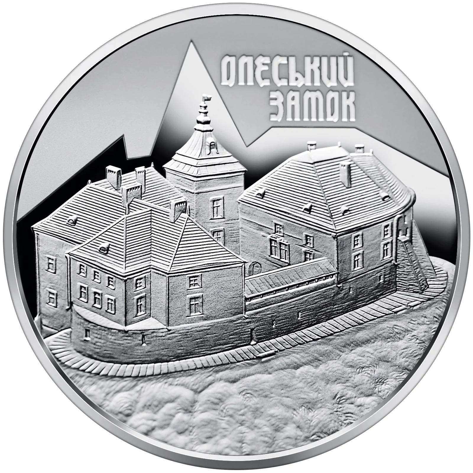 Olesko Castle against a smooth background, with the legend "ОЛЕСЬКИЙ ЗАМОК" above and to the right.