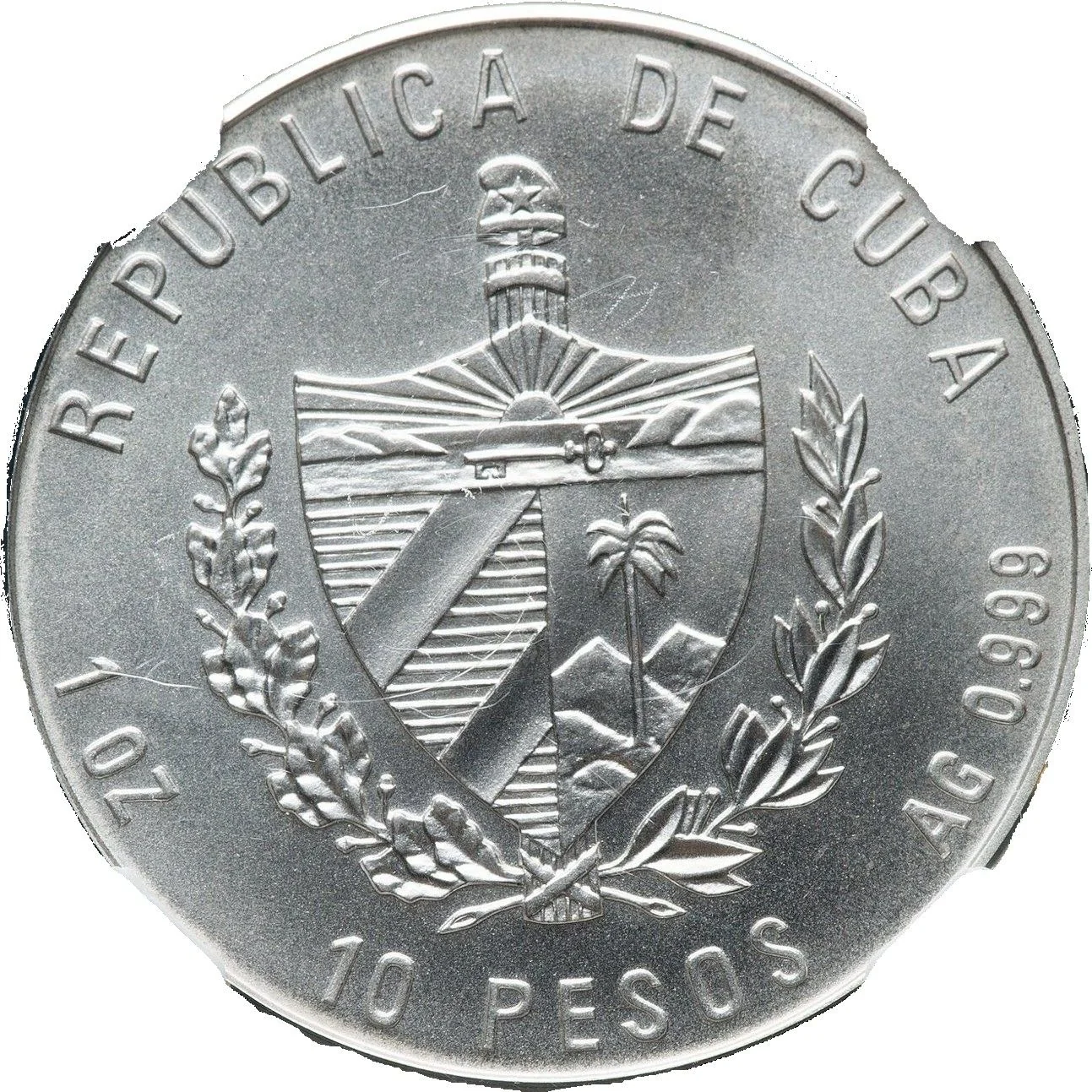 Cuban coat of arms with curved country name above, face value below, and weight and fineness on the sides.
