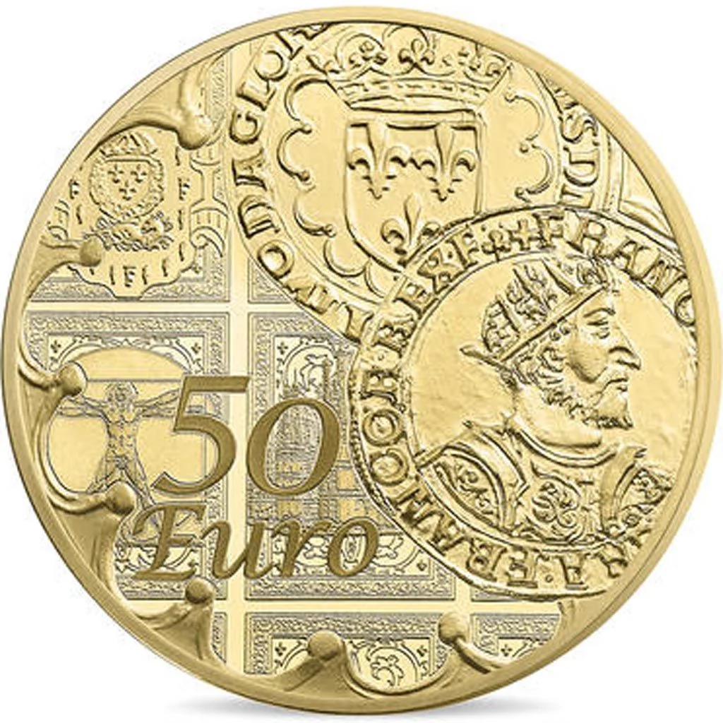 The reverse features Renaissance motifs: the Vitruvian Man, the DSL coat of arms with salamander, and Chambord Castle, all from the era of François I. The face value is at the bottom.
