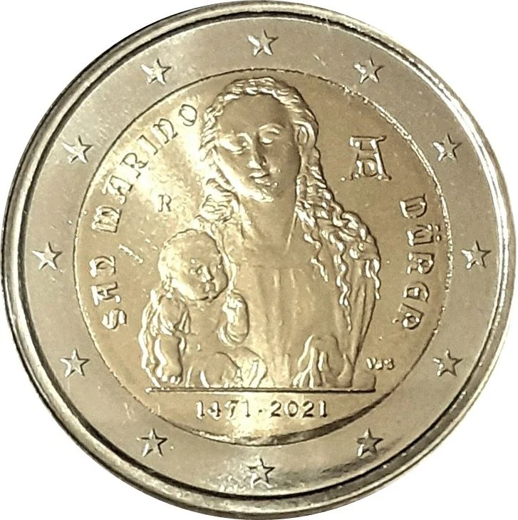 Description: The 2 euro coin commemorating the artist's 550th birthday features a detail from Dürer's 1526 *Madonna and Child* (Uffizi Gallery). The Virgin, emerging from a dark background with a pear, holds the infant Jesus, capturing a familial intimacy. The work exemplifies Dürer's characteristic attention to detail and faithful realism.
