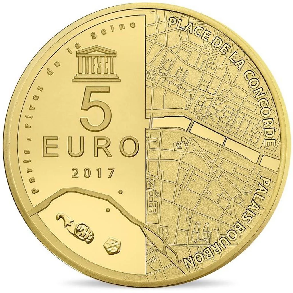 Right: Paris map marking Invalides and Grand Palais. Left: UNESCO logo, "5 EURO," and year.