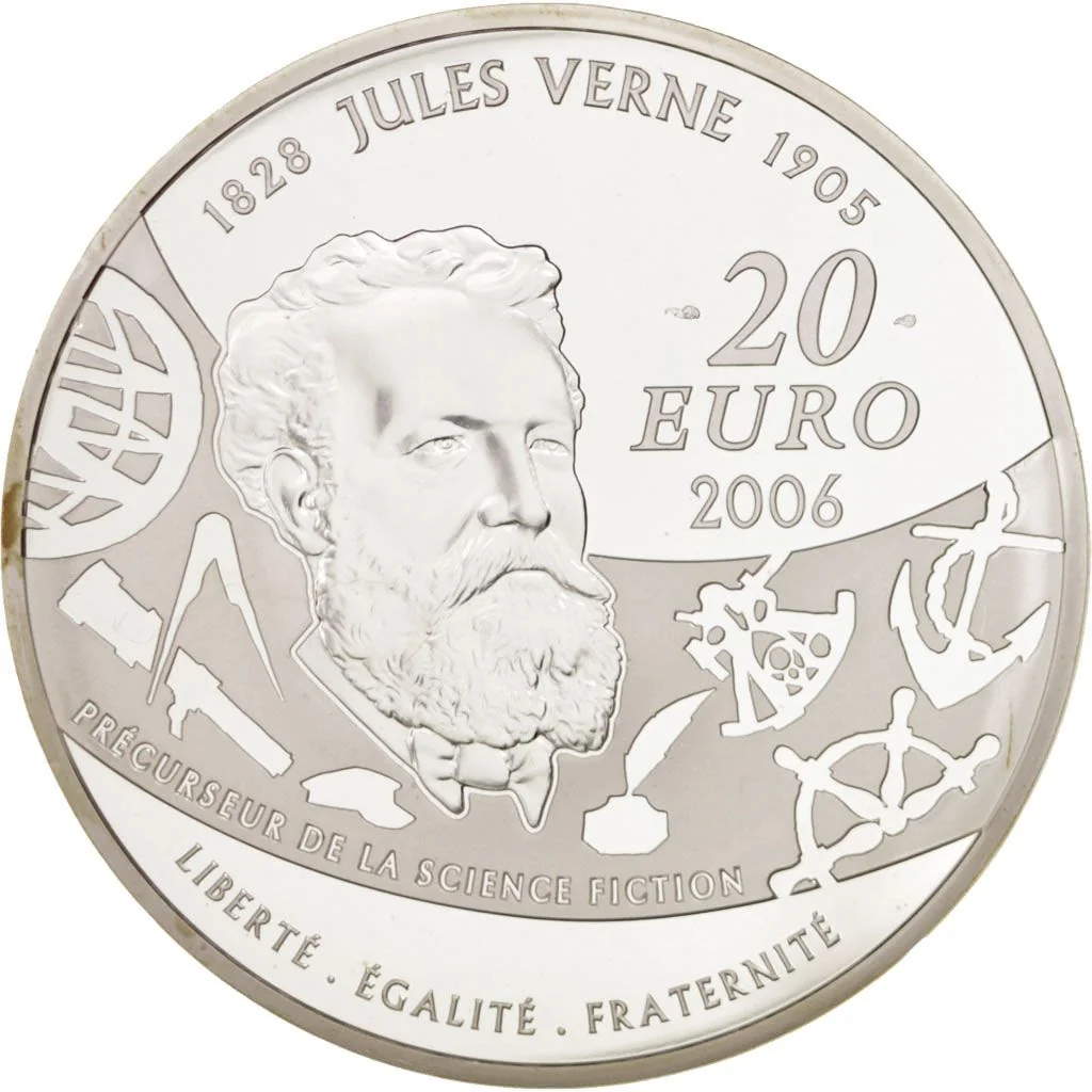 Portrait of Jules Verne amid navigational tools and adventure objects.