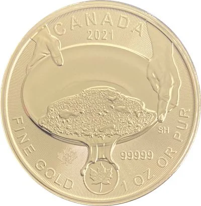 Gold nuggets in a prospector's pan. Weight and fineness below.