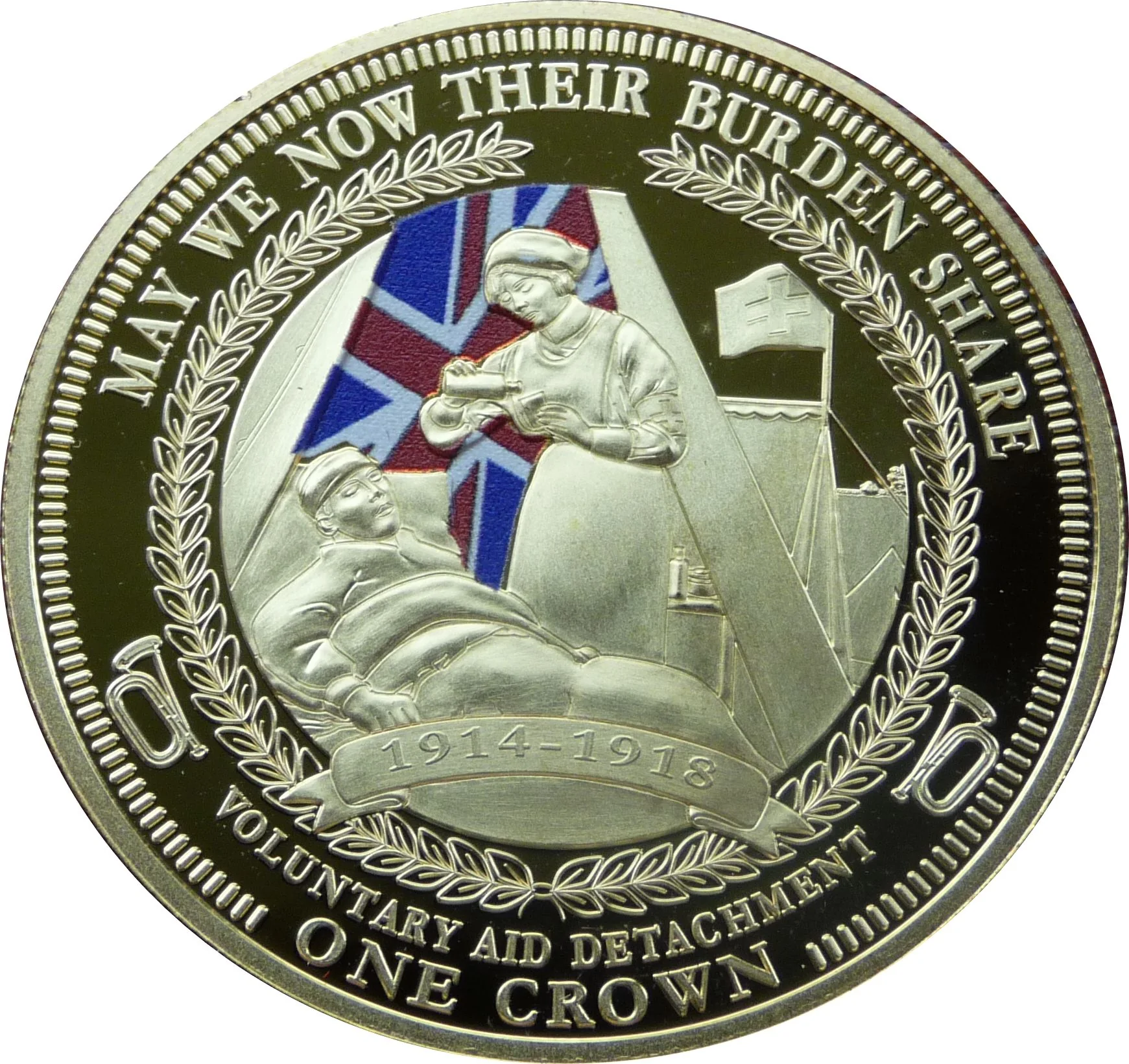 Nurse tending wounded soldier with Union flag wreath, date, and value.