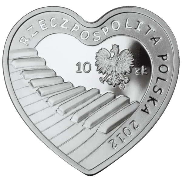 Left: piano keys. Right: Polish eagle and date. Country name around rim.