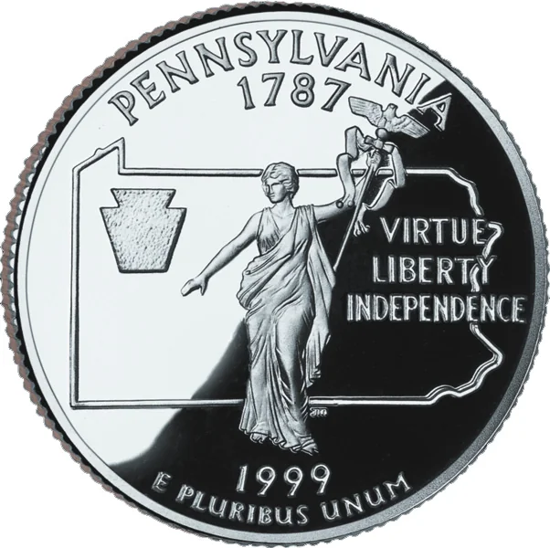 The "Commonwealth" statue, an allegorical female figure, is set before the state outline. It is accompanied by "PENNSYLVANIA," the admission date "1787," a keystone, the words "VIRTUE LIBERTY INDEPENDENCE," and the motto "E PLURIBUS UNUM."