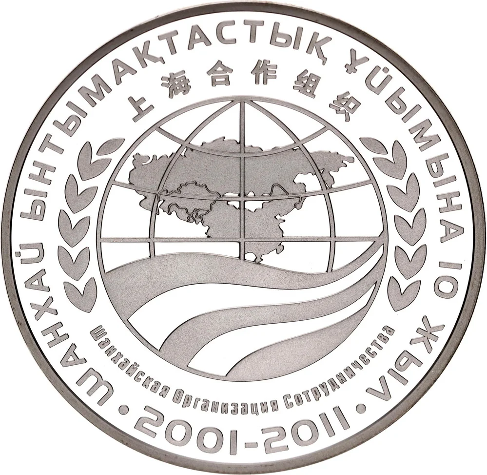 Inscription: ШАНХАЙ ЫНТЫМАҚТАСТЫҚ ҰЙЫМЫНА I0 ЖЫΛ
