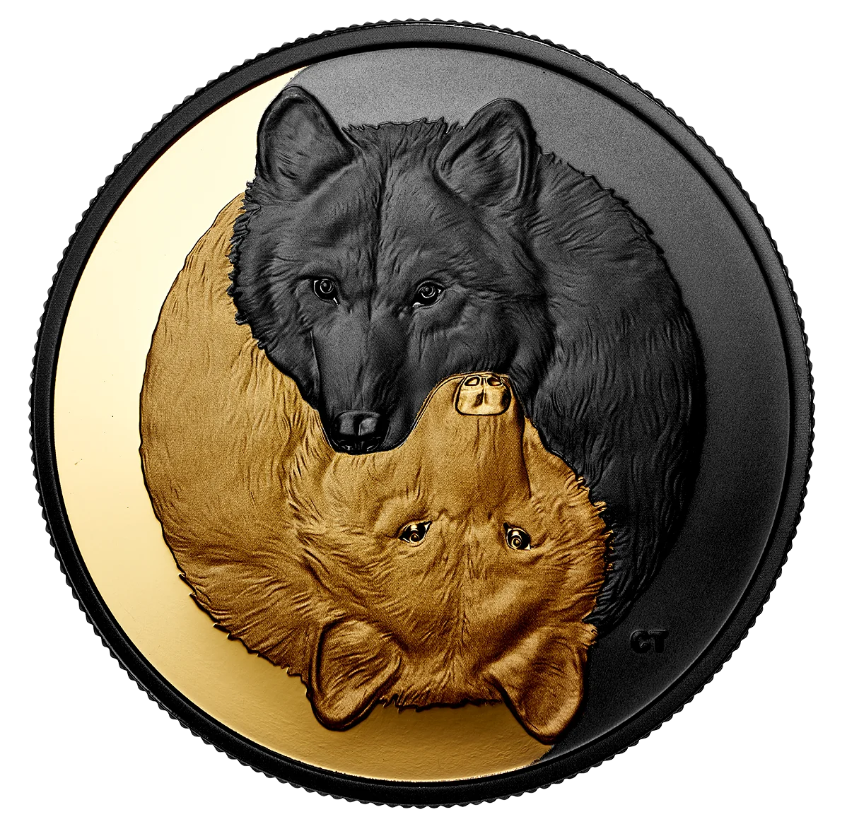 Claude Thivierge's circular reverse design depicts two grey wolves in a yin-yang formation, chin-to-chin, symbolizing pack bonds while gazing at the viewer. The engraved image is split into complementary halves by gold and black rhodium plating.