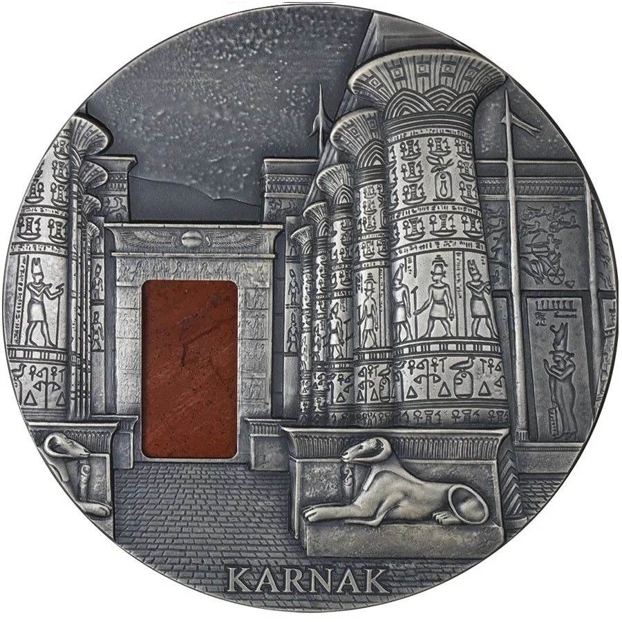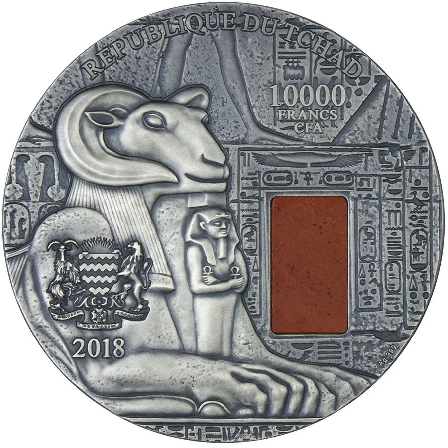 A jasper doorway inset with hieroglyphs, flanked by a ram-headed sphinx and Chad's national arms.
