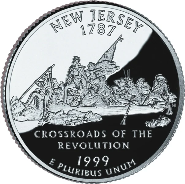 A design based on Emanuel Leutze's 1851 painting of Washington crossing the Delaware, with the legend "CROSSROADS OF THE REVOLUTION", "NEW JERSEY", "1787", and "E PLURIBUS UNUM".