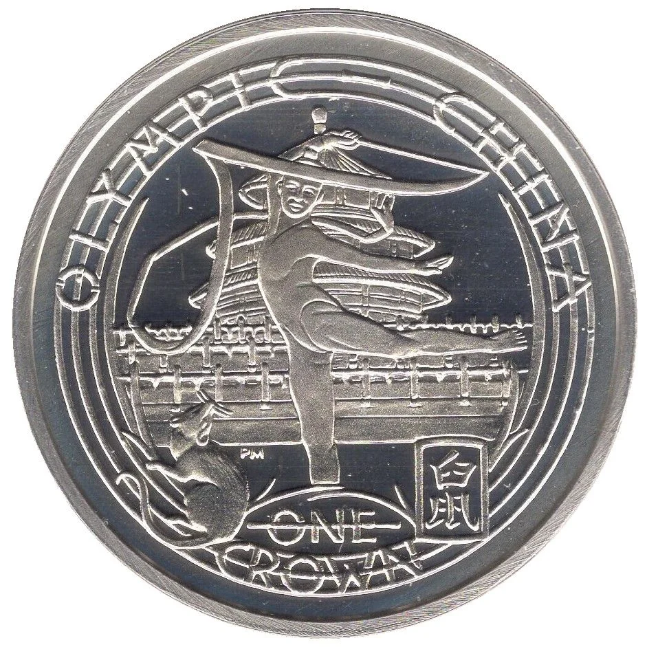 A rhythmic gymnast before Beijing's Temple of Heaven. The 2008 Year of the Rat is shown in script and with a rat image. "OLYMPIC-CHINA" and "ONE CROWN" complete the design.