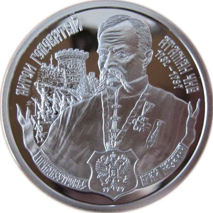 Description: A close-up portrait of ataman Anton Golovaty (1732-1797) before a besieged fortress. Circling Cyrillic inscriptions name him and his title ("Ataman of the Black Sea Cossack Army"). Below, a ribbon reads "Transdniester region, Cossacks’ land" and bears the army's emblem with the year 1787.