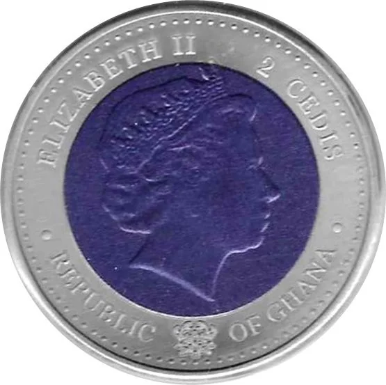 Queen Elizabeth II on colored inner ring; outer ring with lettering and Ghana's coat of arms.