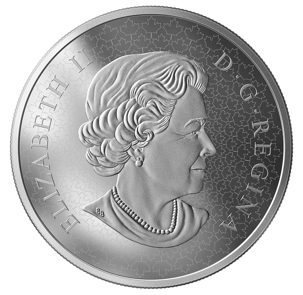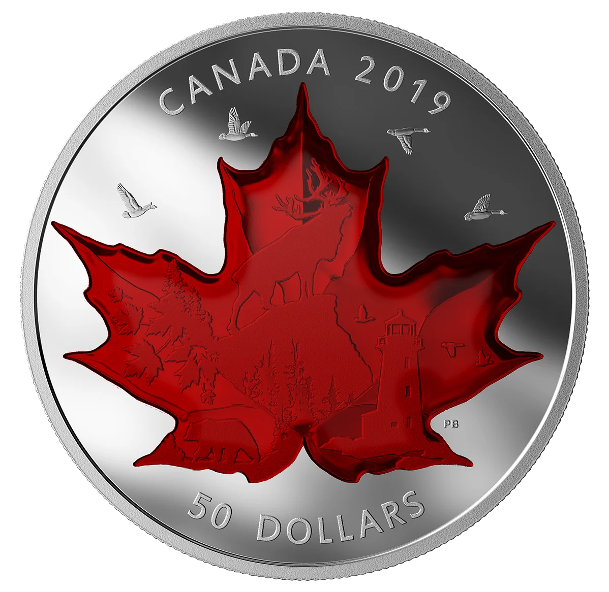 Struck incuse on a proof finish, a flock of Canadian geese flies above a maple leaf. Within the leaf’s points are symbolic engravings: a grizzly bear, maple leaves, a caribou, and a lighthouse. Translucent red enamel tints the leaf, with contrasting frosts highlighting the details.