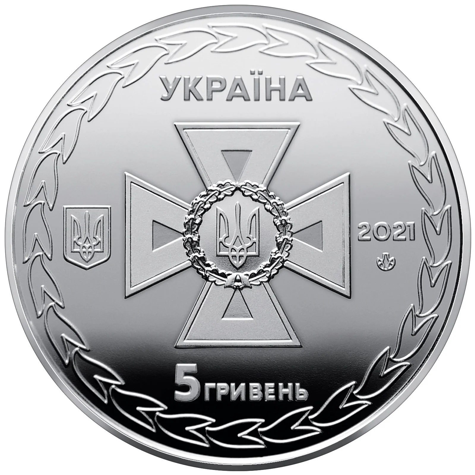 Against a smooth background with floral ornamentation are the inscriptions УКРАЇНА and 5 ГРИВЕНЬ. Centered is the State Emergency Service logo, flanked left by Ukraine's small coat of arms and right by the issue year 2021 and the mint mark.