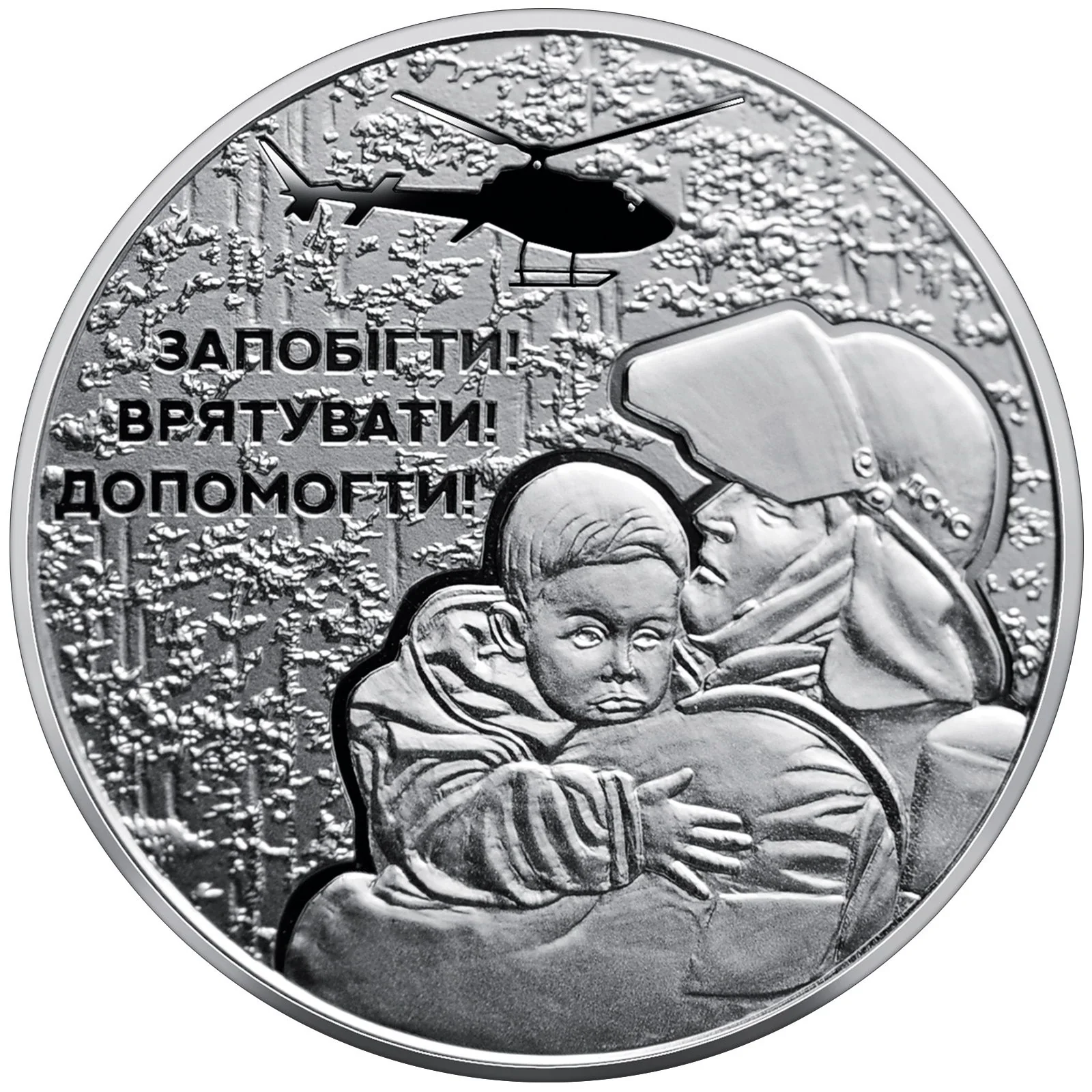 A rescue worker holds a child, with a helicopter outline above and the words ЗАПОБІГТИ!/ВРЯТУВАТИ!/ДОПОМОГТИ! to the left.