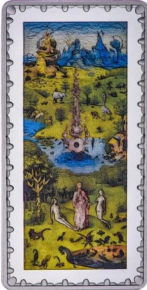 Color reproduction of the left panel from Hieronymus Bosch's 1500-1505 triptych, "The Joining of Adam and Eve," housed in Madrid's Prado Museum.