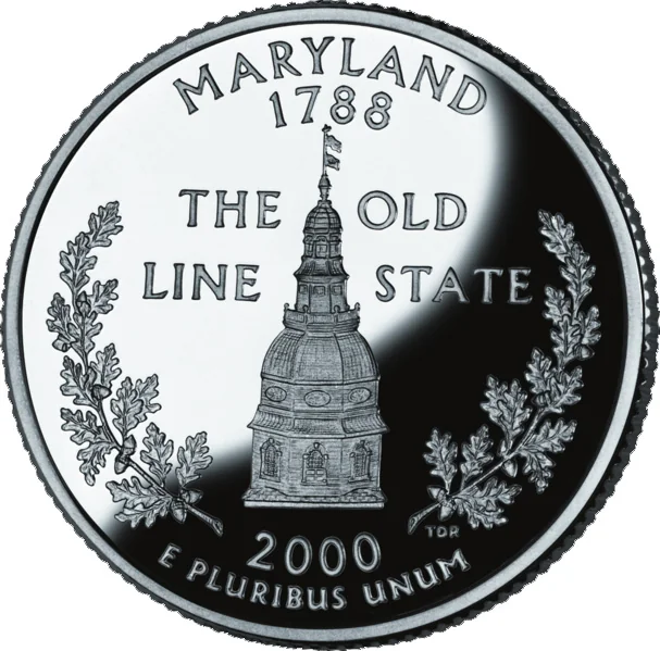 The Maryland Statehouse dome, flanked by oak leaves, features the state name, "MARYLAND," its 1788 admission date, nickname "THE OLD LINE STATE," and motto "E PLURIBUS UNUM."