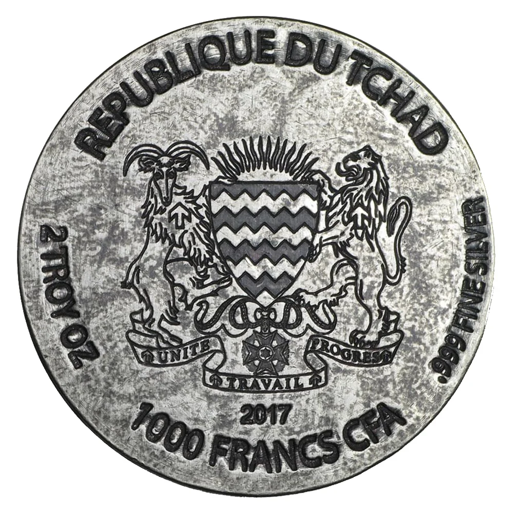 Description: The reverse displays Chad's coat of arms: a heraldic goat and lion flanking the national shield above a banner reading "Unite, Travail, Progres."